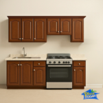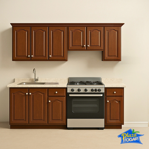 Diseñada en una medida estándar de 2.40 m, esta cocina integral aprovecha cada centímetro al máximo: amplios módulos inferiores para utensilios grandes, prácticos entrepaños superiores para vajilla y despensa, y una tarja de acero inoxidable lista para acompañarte en tu día a día.