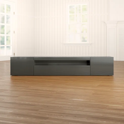 Este mueble de TV combina bien con los estilos modernos y contemporáneos. Está hecho de cuerpo madera y  frentes de MDF grueso de la mejor calidad, terminado alto brillo. Tiene mucho espacio de almacenamiento para dispositivos electrónicos gracias a sus dos armarios y un estante abierto. Este soporte de televisión puede acomodar televisores grandes de hasta 88 pulgadas.