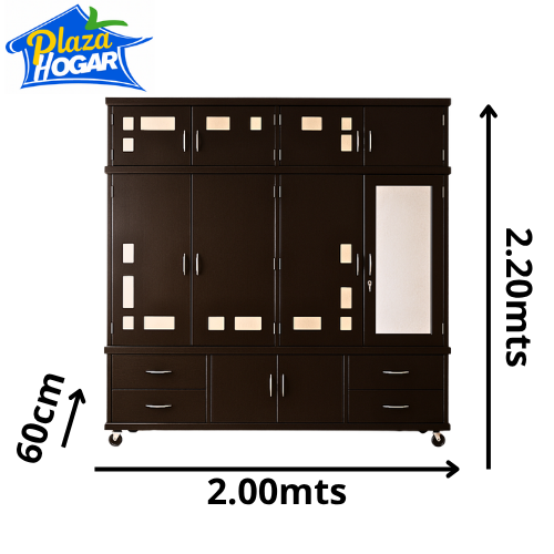 Fabricado en 3 piezas horizontales para un armado más práctico y resistente, este ropero tiene 2.20 m de alto x 2.00 m de ancho, ofreciendo espacio de sobra para toda tu ropa, accesorios y artículos personales.
