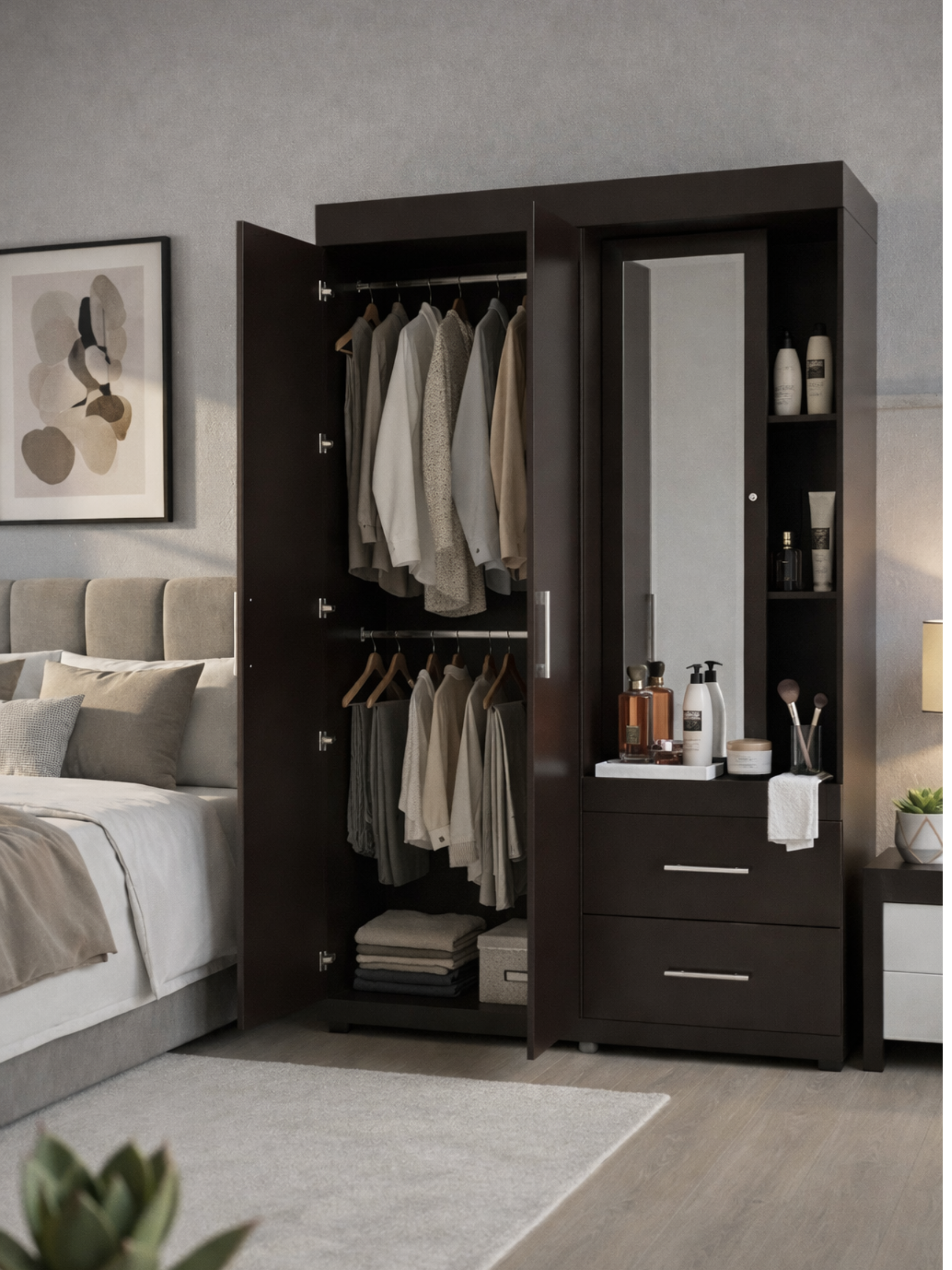 • Tu Estación de Belleza Personal: A diferencia de los roperos convencionales, el Rayva incluye un espejo integrado y repisas laterales de fácil acceso. Es el lugar perfecto para tus perfumes, relojes o maquillaje.